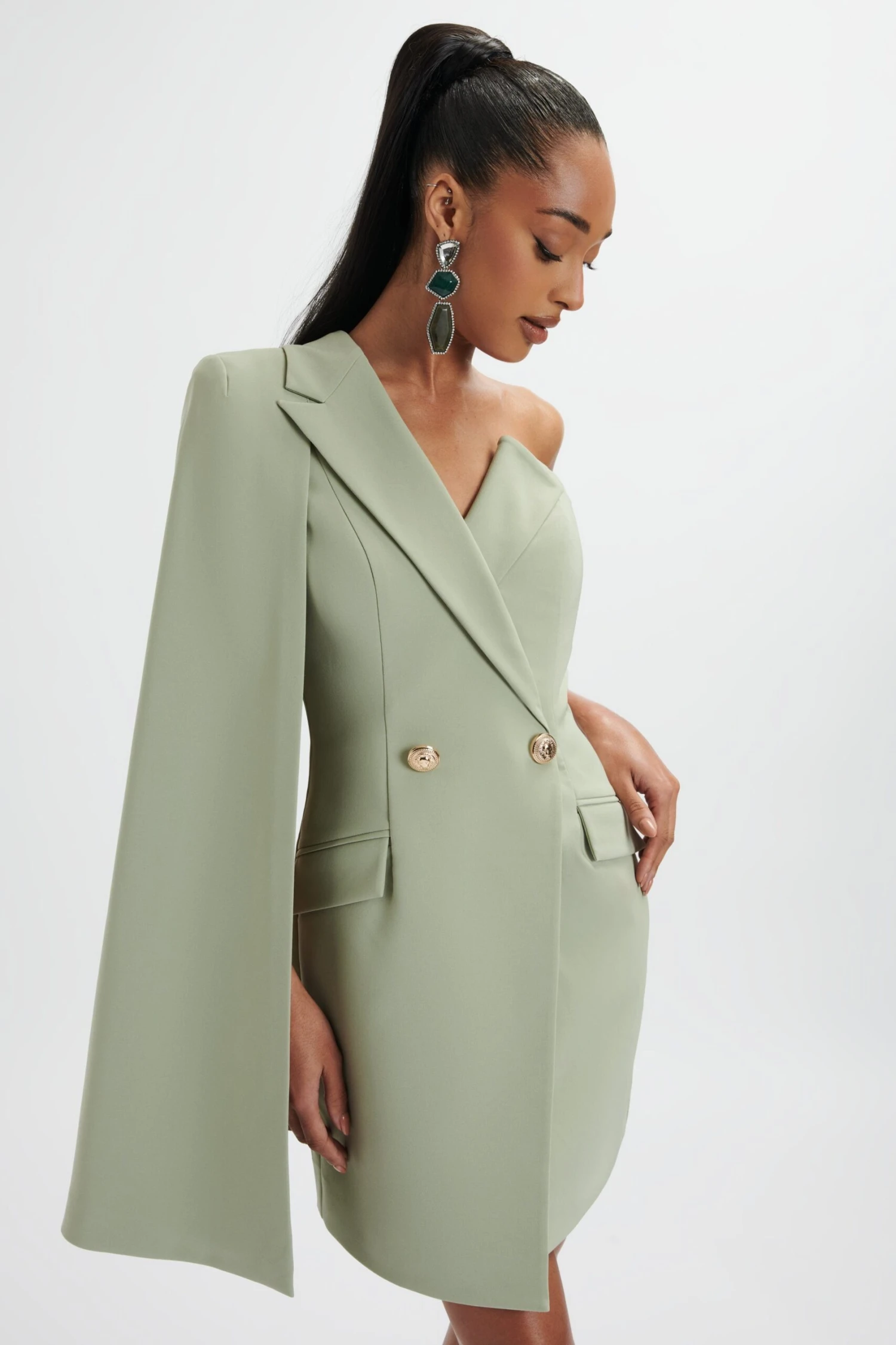Introducing the perfect combination of style and sophistication with our new season SS24 One Shoulder Cape Blazer Dress in Sage Green. This contemporary tailored piece features an asymmetric one shoulder cape and a tailored wrap over front, finished with luxury gold buttons. Elevate your style with this must-have blazer dress.Â