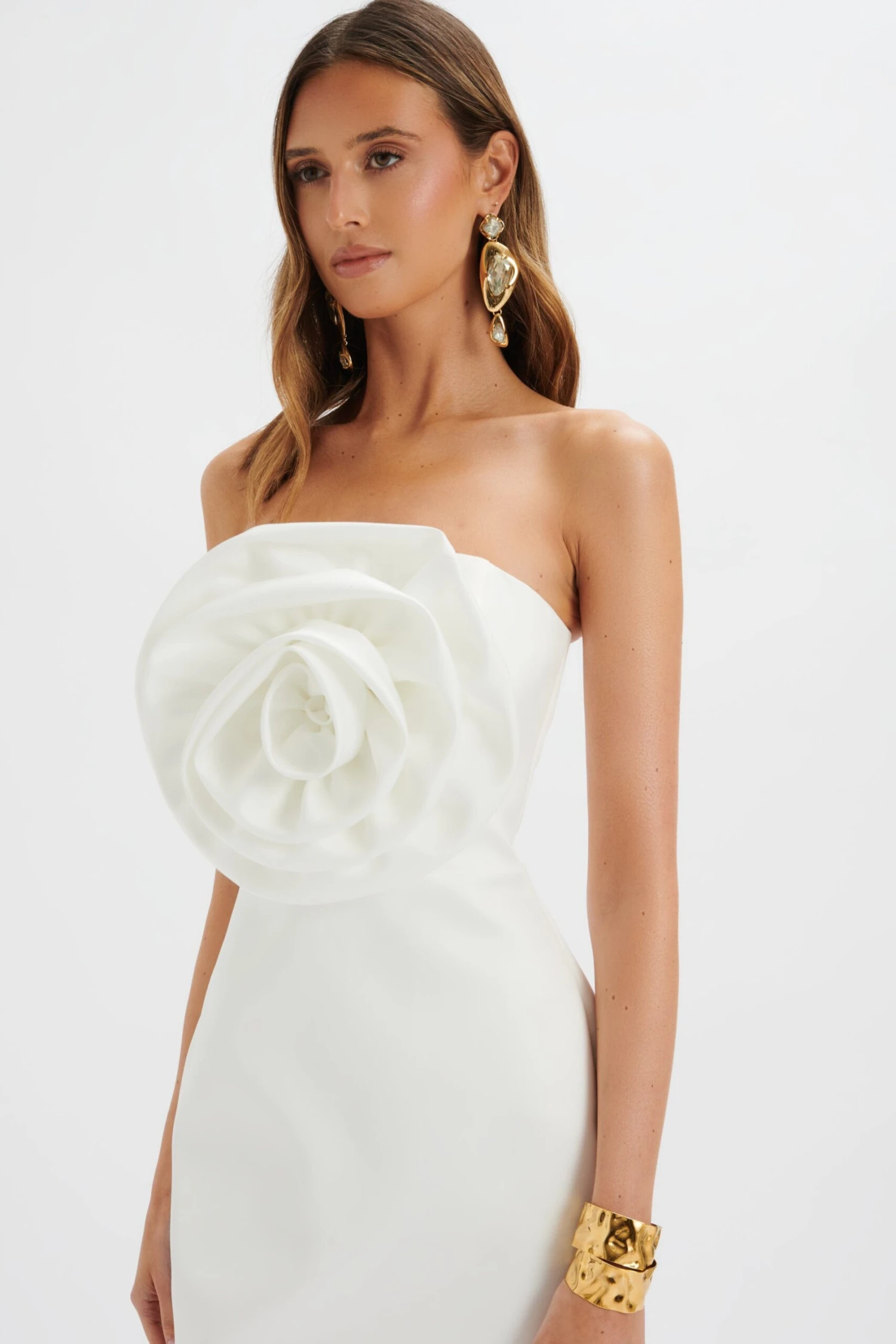 Expertly crafted with premium satin material, the BRYANNA 3D Flower Bandeau Satin Mini Dress in White boasts a large 3D flower and elegant bandeau design. The perfect mix of elegance and style, this dress is sure to make a statement.