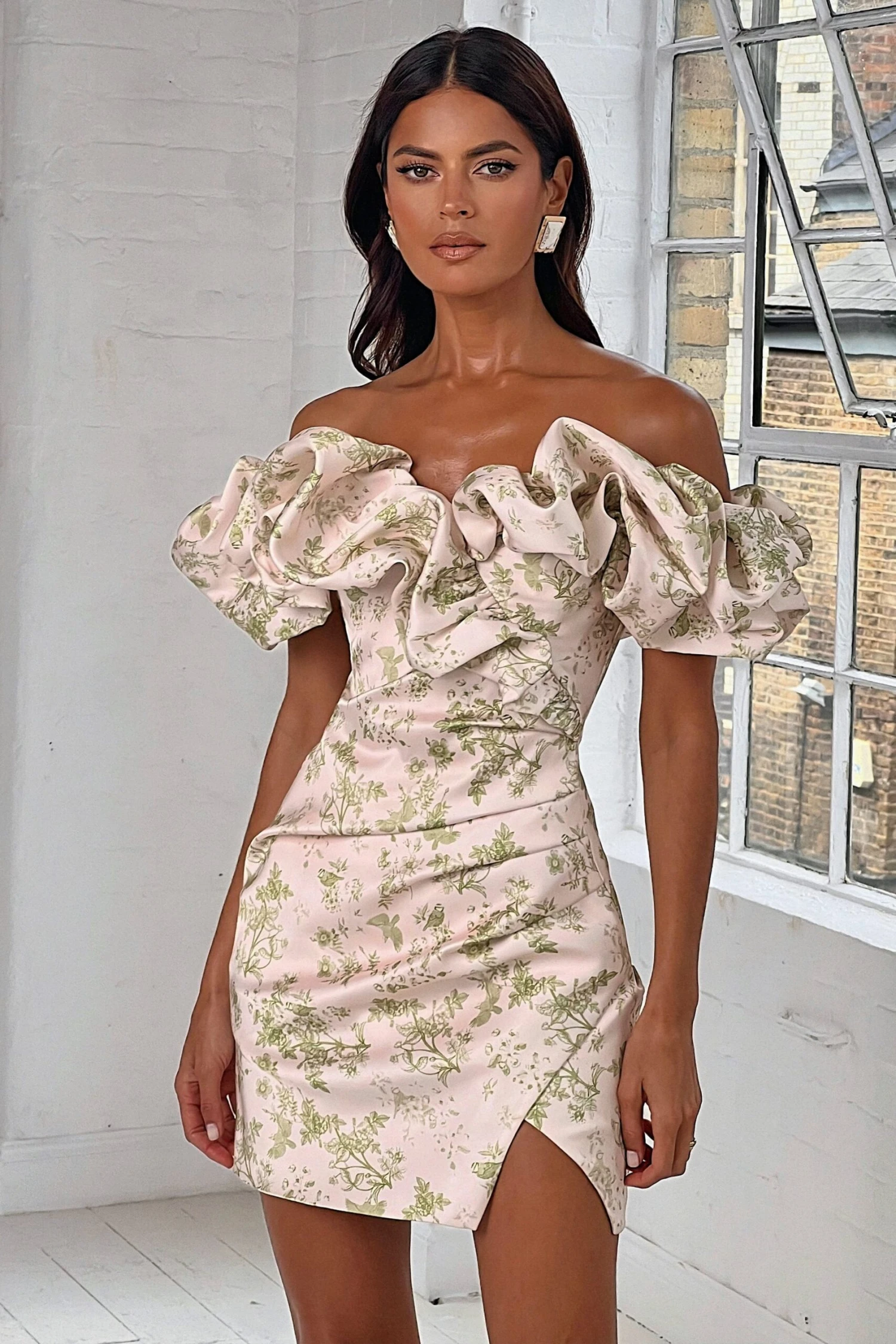 Effortlessly exude spring glamour in our CARRIE Bonded Satin Bardot Mini Dress. Made with luxurious bonded satin, this off-the-shoulder mini dress features a stunning green porcelain print, elegant puff sleeves, and a wrap mini skirt with delicate pleat detailing. It is the perfect dress for a spring wedding or day at the races.