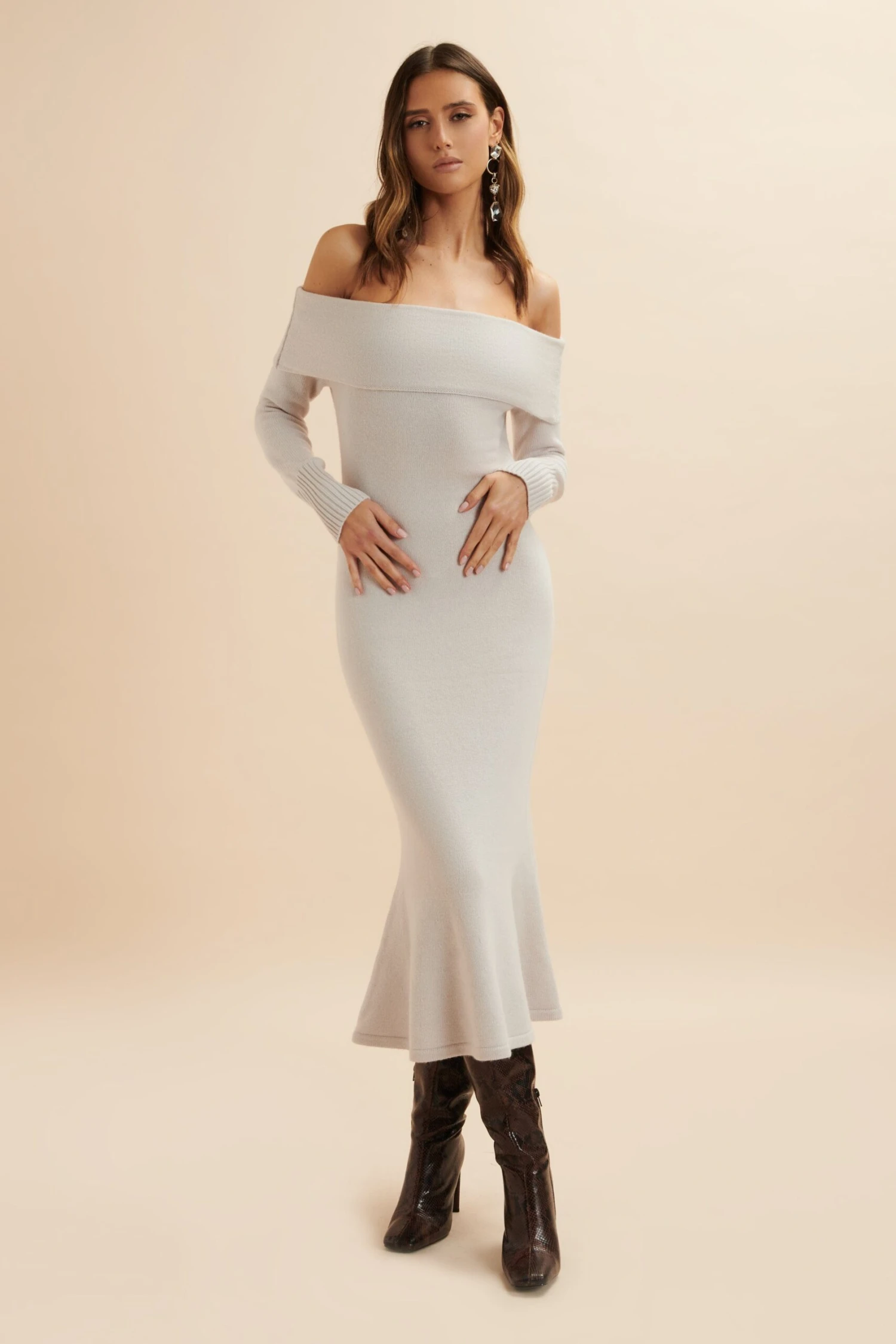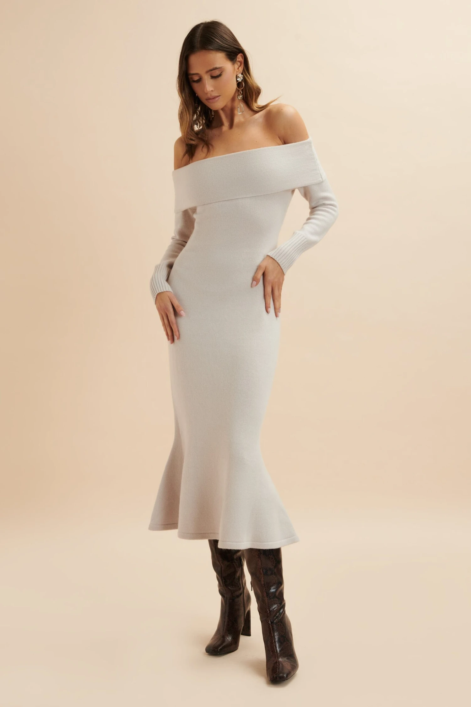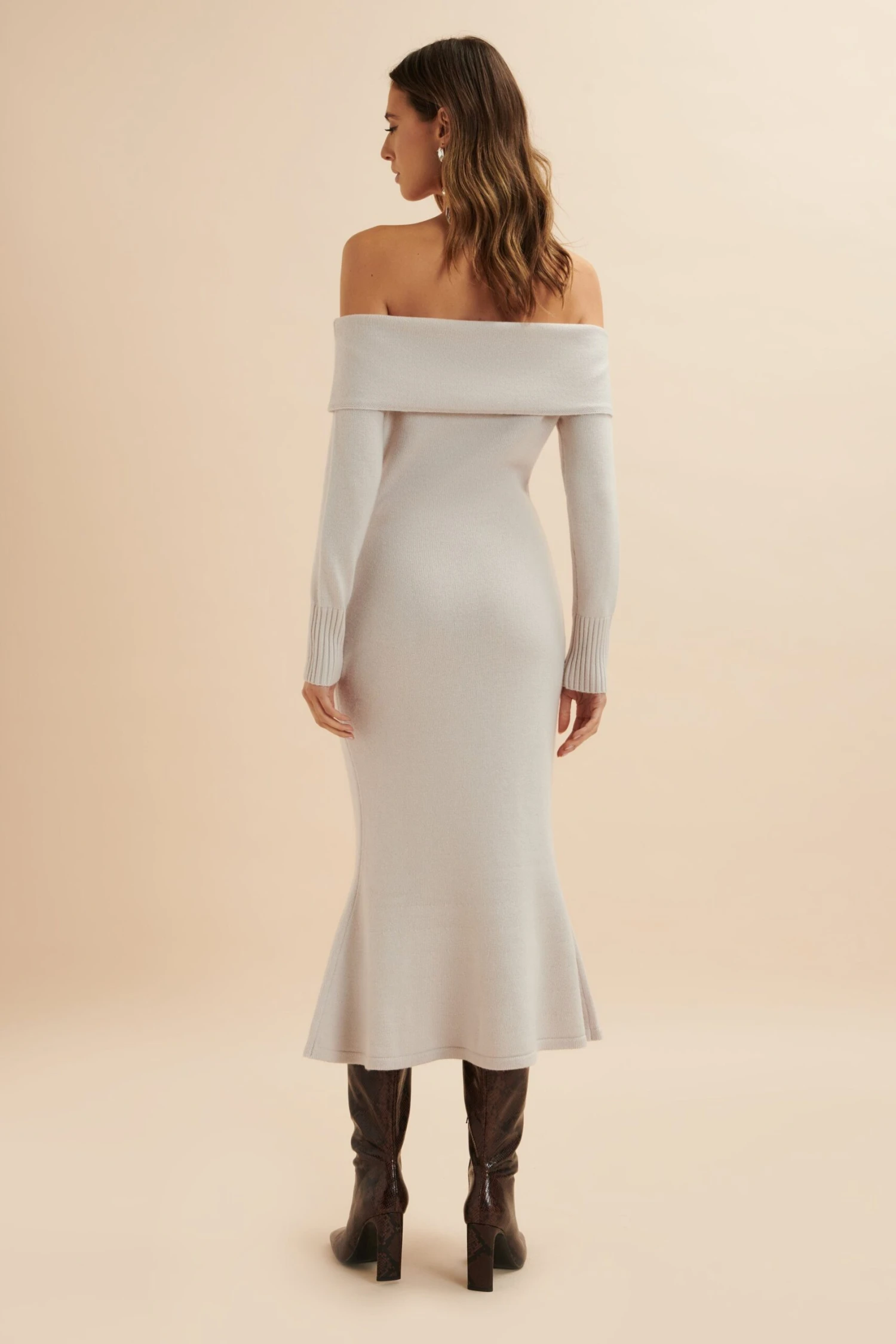 Skilfully crafted with a blend of wool, enhanced with cashmere, our CLOVER dress offers a plush and lavish feel. The folded Bardot neckline and snug sleeves, with textured ribbed cuffs, enhance the off-shoulder design, while the fit-and-flare fishtail hem delivers a touch of refinement. Ideal for any event, this midi dress radiates grace and ease.