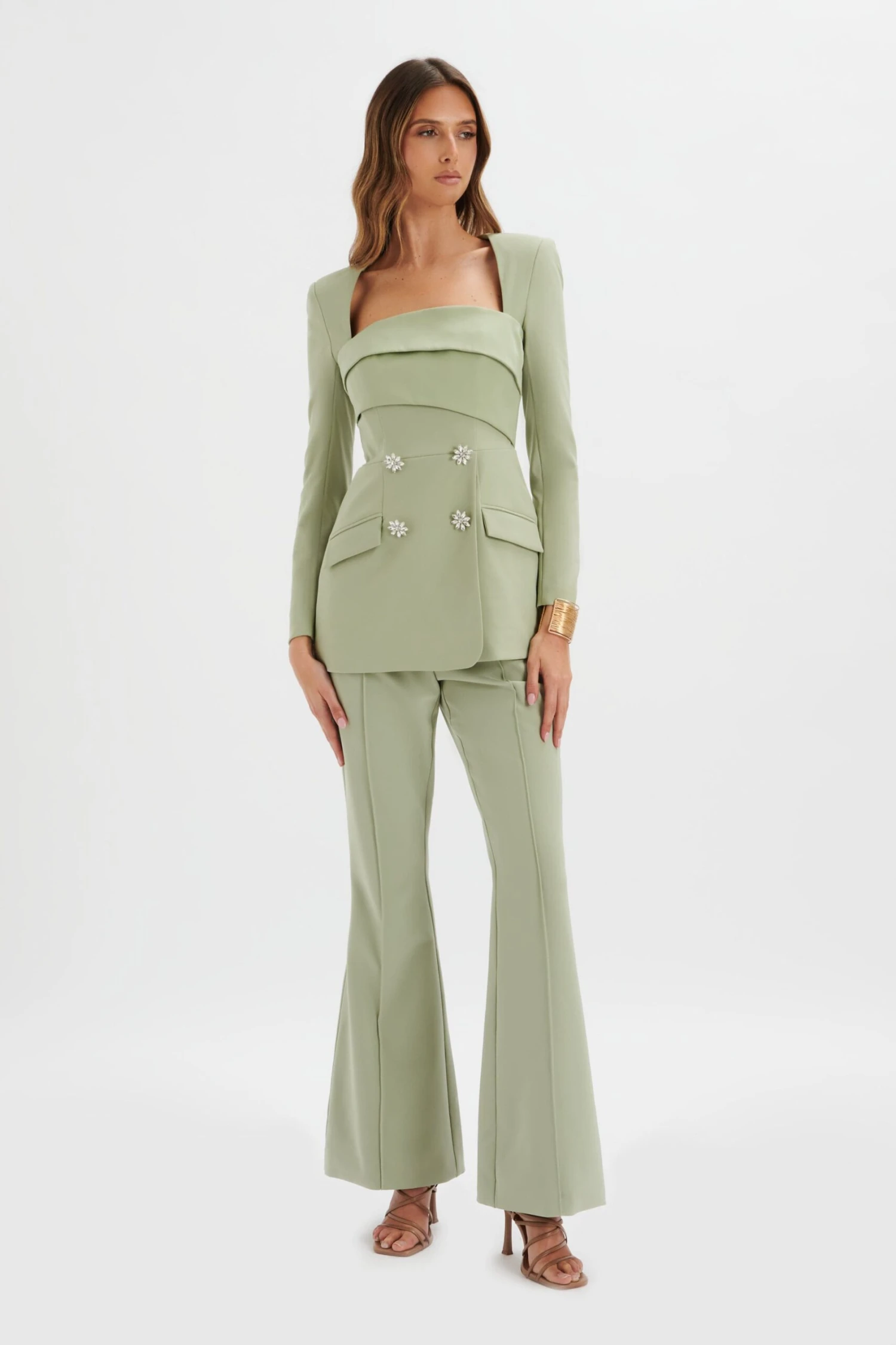 Introducing our FREJA tailored blazer. Crafted with high quality crepe in a stunning shade of sage green, this jacket features a flattering square neckline with a contrast bonded satin pleated bust panel, glamorous diamante buttons, and shoulder pads for a premium silhouette. With concealed corsetry and 9 pieces of boning, this blazer offers both style and sculpted support.