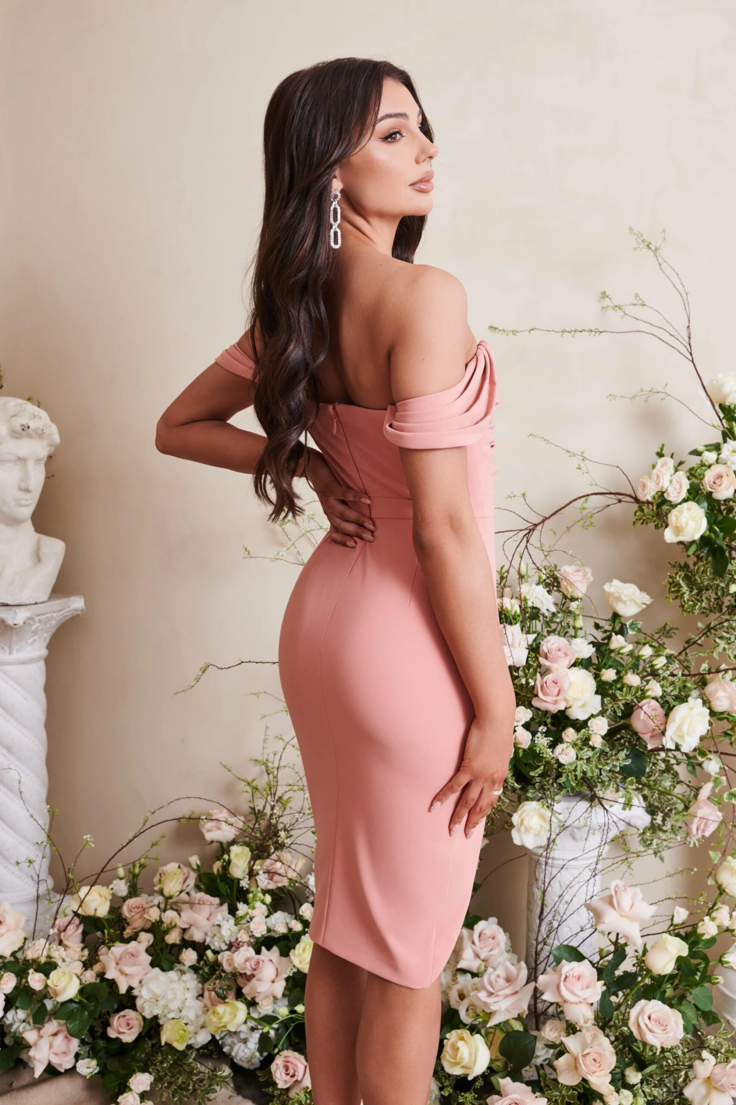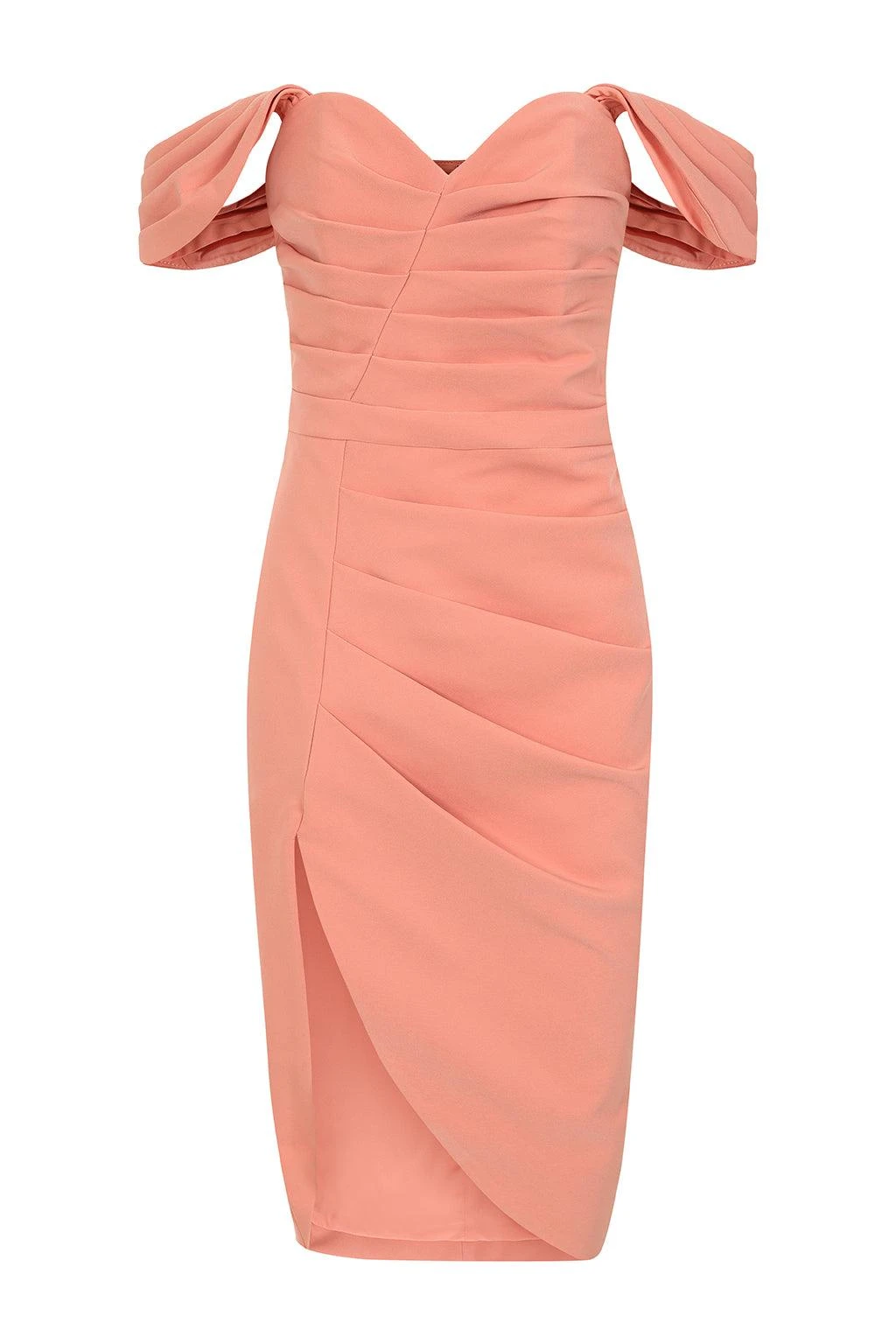 Our best-selling HAILEY bardot midi dress is back in spring ready coral. The bardot neckline, cinched waist and delicate pleating detail create a feminine, sexy silhouette.