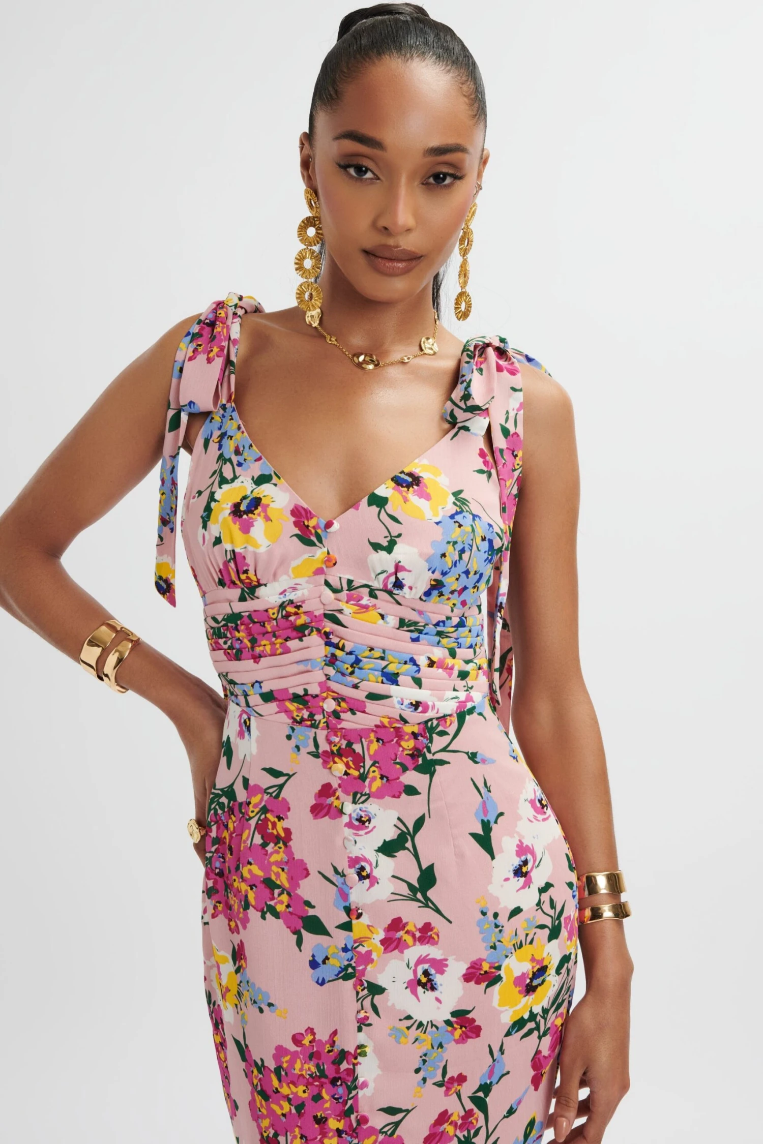 Expertly crafted in premium soft satin, with a delicate pink floral print. Its longline midi length and fit & flare hemline provide a close to body fit that flatters any shape. The delicate micro button detailing and self-fabric tie straps add a touch of elegance, while the bust and waist darts enhance your natural curves. Complete the look with the flattering pleated waistband for a sophisticated and stylish statement.