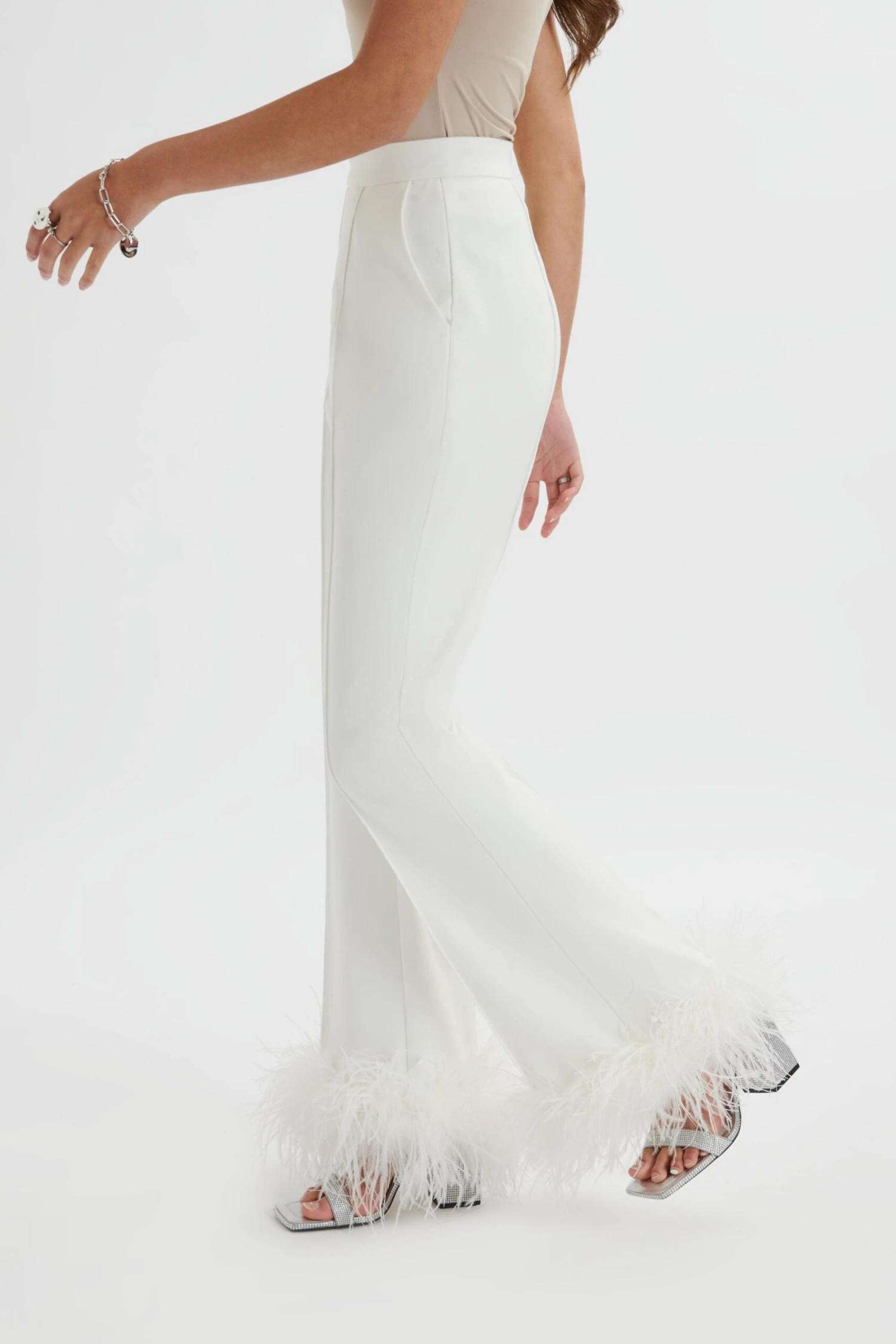 Introducing the NAHLA trouser. Its Premium Crepe fabric provides a luxurious feel while the tailored fit accentuates your figure. The statement ostrich feather hemline adds a touch of elegance, perfect for weddings and Ladies Day events. With functional side pockets and a centre back zip fastening, style meets functionality.