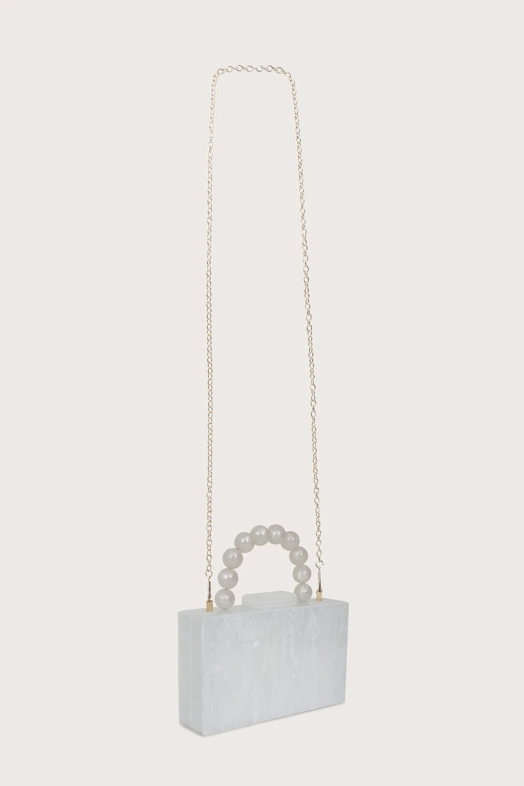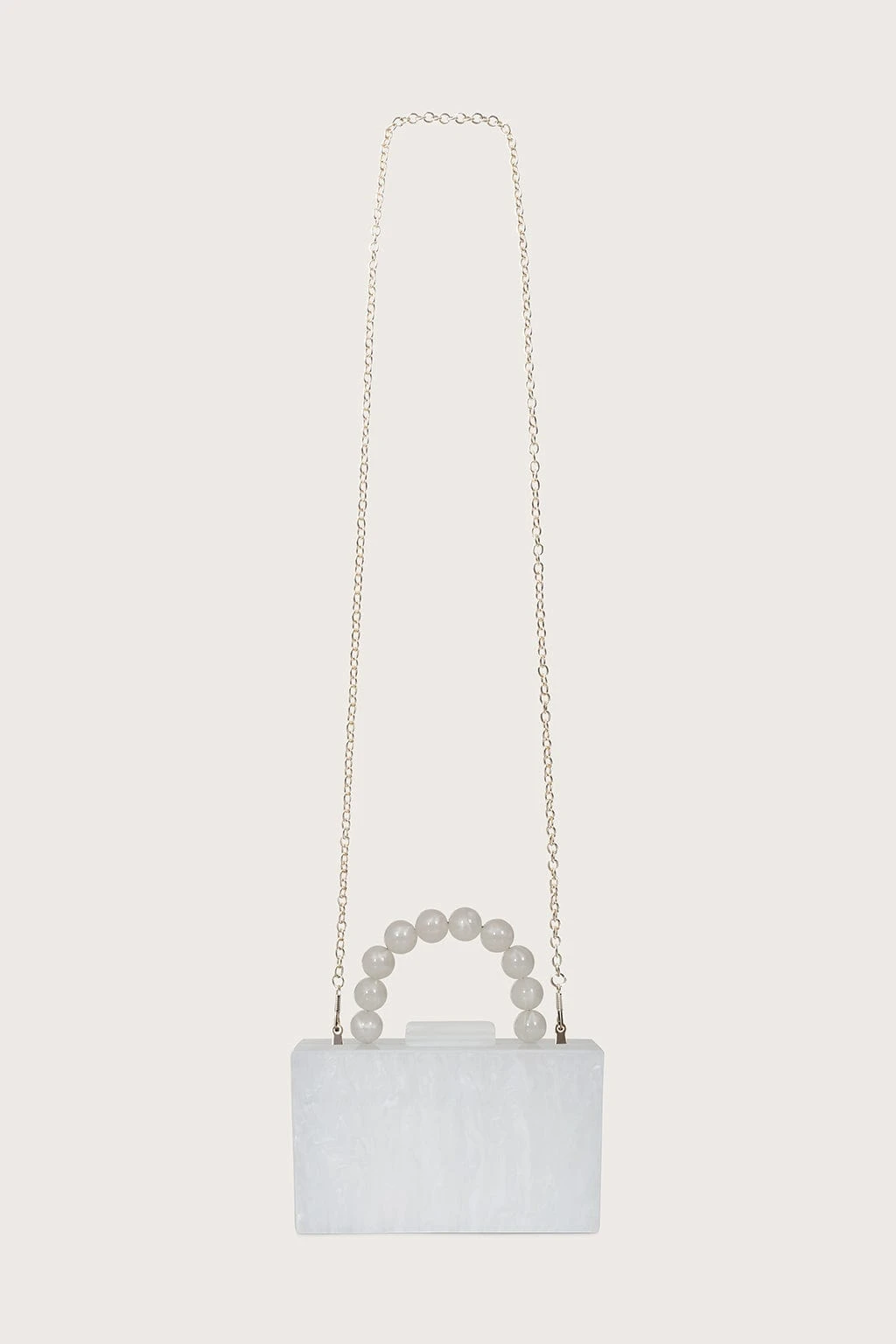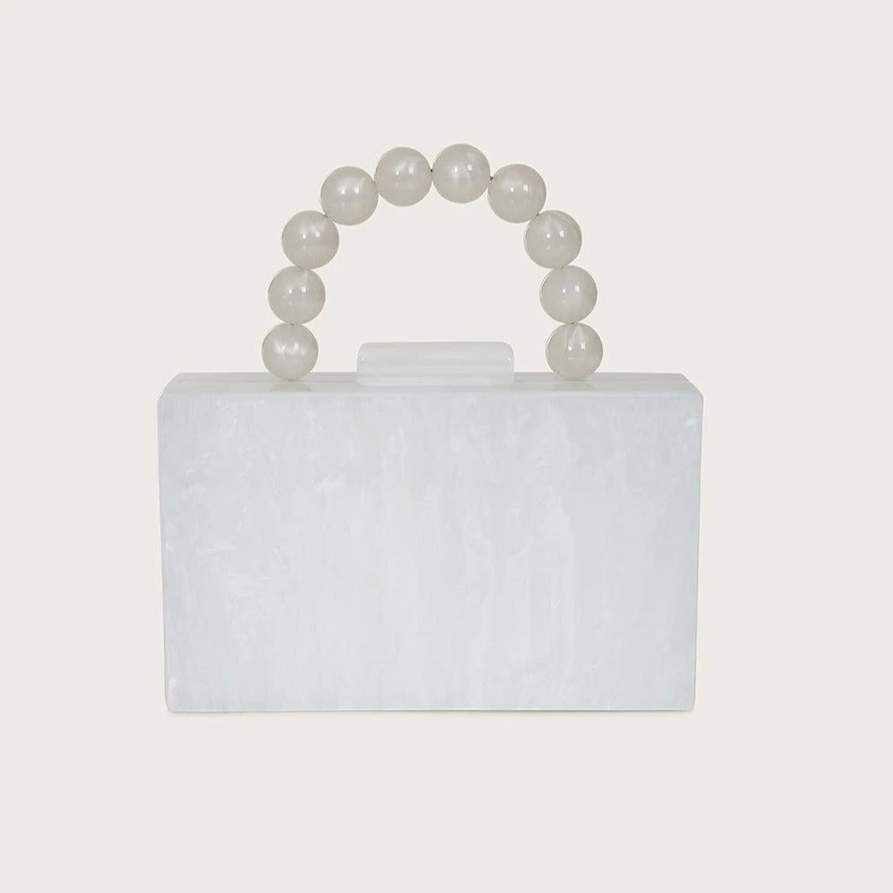Introducing the REYA Bead Handle Marbled Box Clutch Bag in White—a fusion of modern sophistication and timeless elegance. Crafted with meticulous attention to detail, this exquisite accessory features a pristine white marbled design that exudes refined beauty. The standout feature is its stunning bead handle, adding a touch of glamour to every ensemble. With its compact yet spacious interior, this clutch is perfect for carrying your essentials in style.