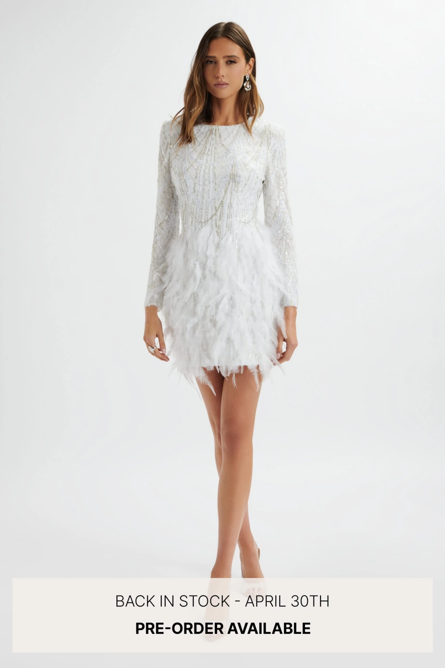 Introducing the SELENE mini dress in white. With exquisite sequin embellishments and beaded embroidered sheer mesh, this dress exudes elegance. The bespoke feather appliqué skirt, concealed shoulder pads, and close-to-body fit create a premium silhouette. Customised with bust and waist darts and a concealed centre-back zip for shaping and functionality. Lined, faced, and bagged out in double layer white power mesh.